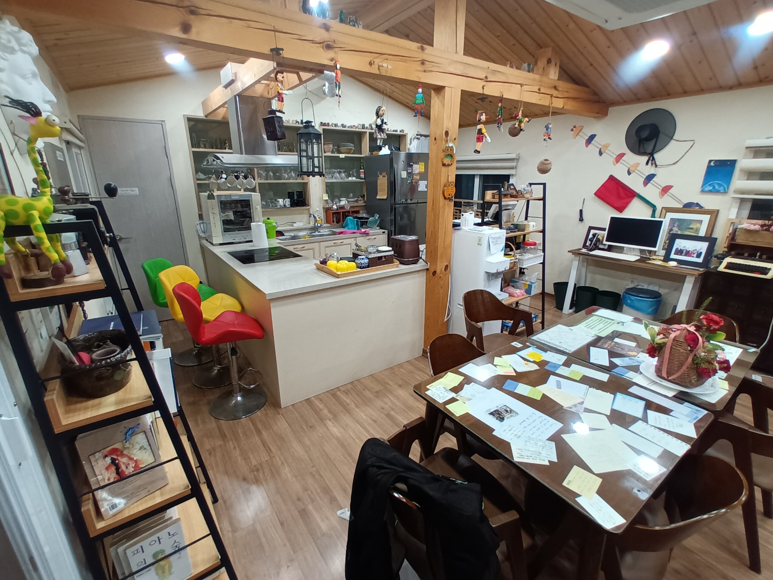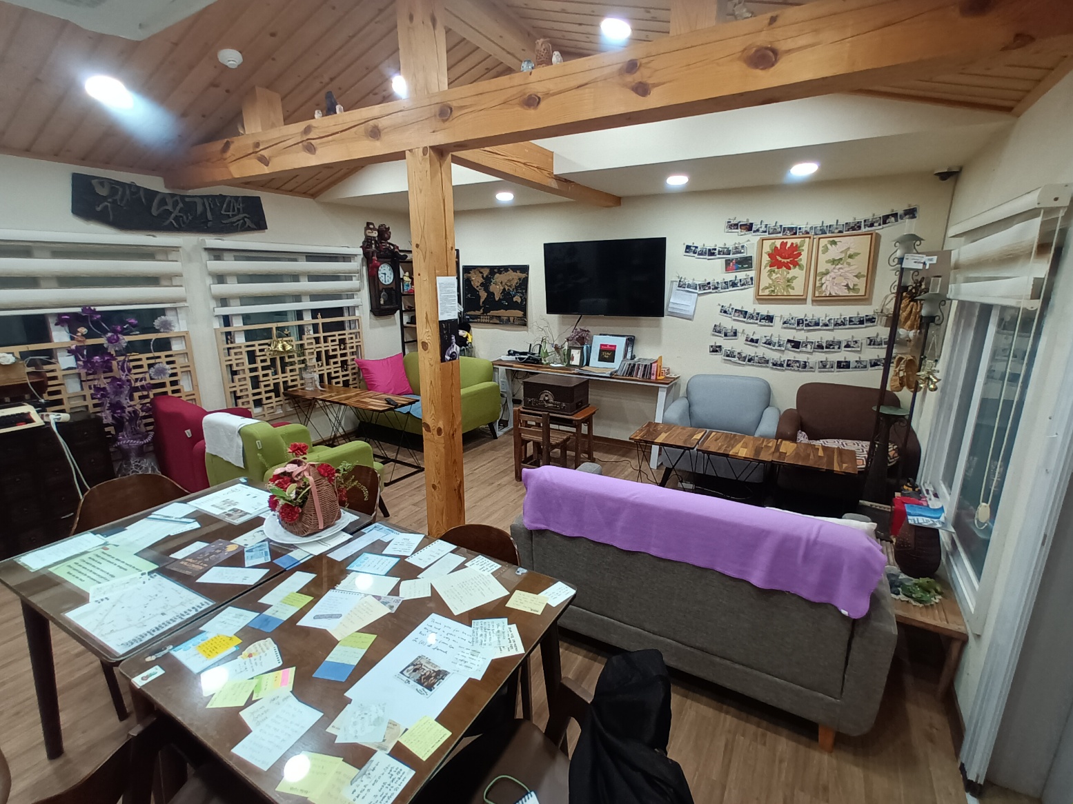 2층에는 손님들이 머무를 수 있는 휴게실이 있었다. 휴게실 바깥에는 테라스도 있었는데, 지는 노을을 바라보며 맥주 한 잔 하기 좋은 분위기였다.(사진을 찍었는데, 어디갔는지 모르겠다 ㅠㅠ). 다양한 사람들의 방문 후기와 사진들이 있었다.